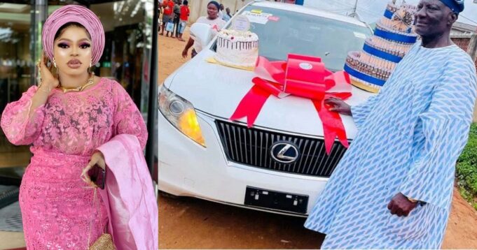 Bobrisky who recuperating after getting body enhancement surgery, went out of his way to put a smile on his father’s face with the car gift alongside a massive cash cake.