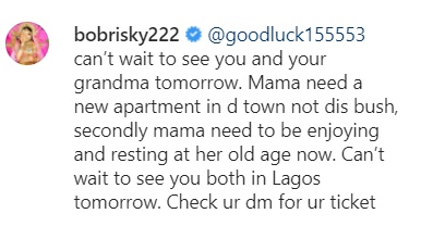 can’t wait to see you and your grandma tomorrow. Mama need a new apartment in d town not dis bush, secondly mama need to be enjoying and resting at her old age now. Can’t wait to see you both in Lagos tomorrow. Check ur dm for ur ticket