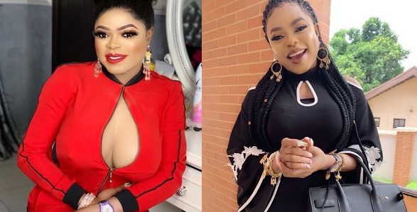 Bobrisky is seen smiling for the camera as he dons a red long-sleeve top with a plunging neckline, revealing massive cleavage.