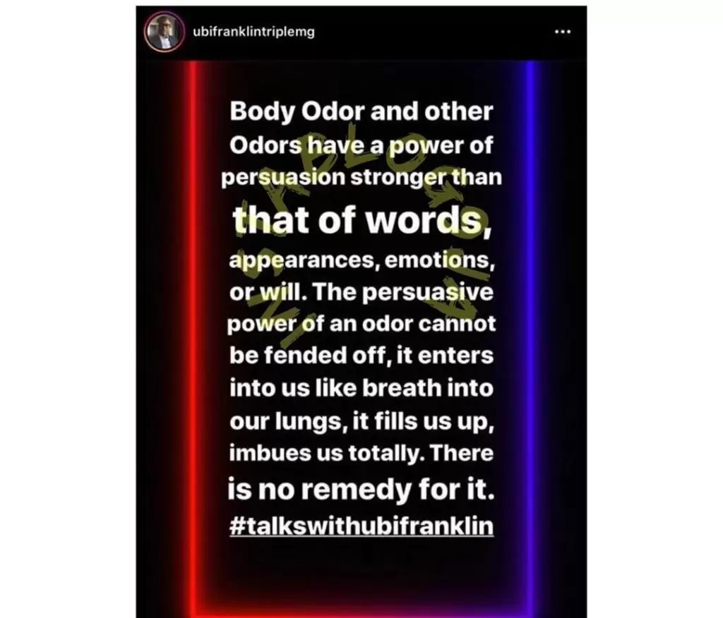 On the latest update of the back and forth between Ubi and Tacha, the former has sent a subtle shade at the latter, referencing the infamous ‘body odor’ that the reality star is alleged to have.