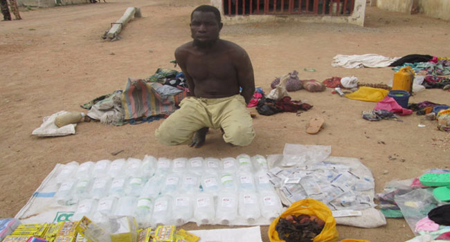The troops pursued them but were only able to apprehend Kadiri Umate, 35, while others fled into the bush. The patrol team recovered 35 packets of 500ml of Glocose Intravenous infusion (Drip), assorted analgenics and pain killer drugs, clothes, bathroom slippers, insecticides, salt, kolanuts and a bicycle.