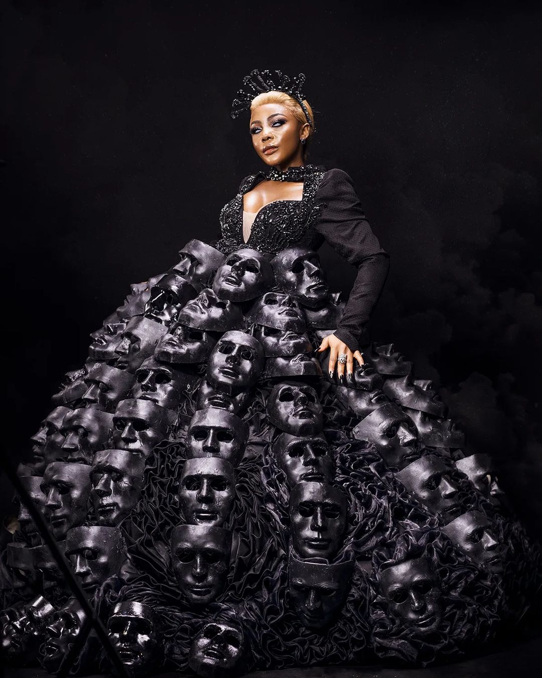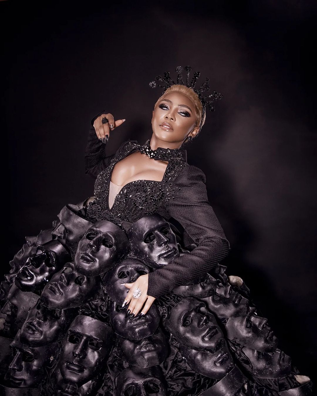 The Big Brother Naija star pulled up at the award show on Saturday, May 14, in a black dress decorated with multiple skulls, and a scary eye makeup.