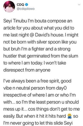“Seyi Tinubu I’m bouta compose an article for you about what you did to me last night @ David’s house. I might not be born with silver spoon like you but bruh I’m a fighter and a strong hustler that germinated from the slum to where I am today.