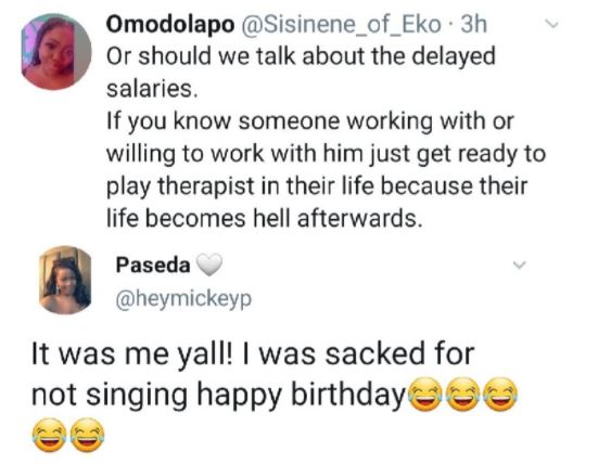One accused him of sacking a staff for not singing ‘happy birthday’, and paying his employee’s salaries late.