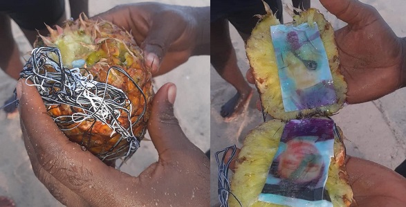 “Things we see on the Atlantic shoreline. Pictures of a guy and a lady placed in a pineapple & bound. Voodoo? Love charm? Some sweet juicy love is about to turn very bitter innit?”