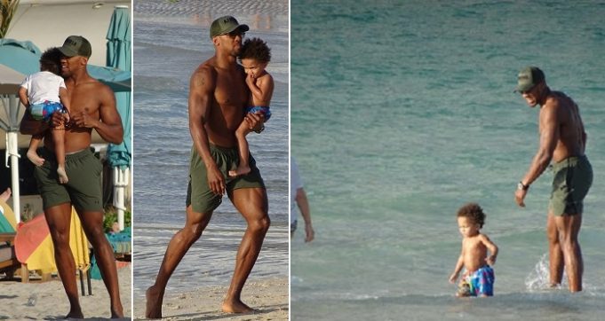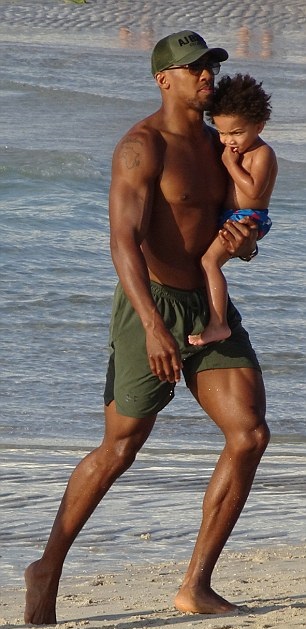 Cuddling up with the youngster, the 28-year-old boxer waded into the sea with Joseph on his hip, before the group frolicked in the waters together.