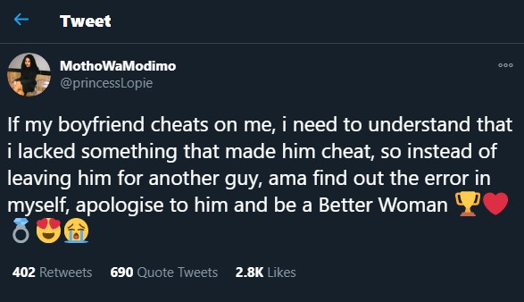 According to the lady, identified as Mothowa Modimo, if her man cheats on her, then it means that she did something to make him have an affair — she then says rather than leave cheating partner, she would find the error in herself and apologize.