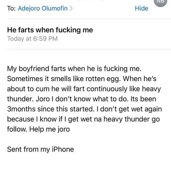 “My boyfriend farts when he is lashing me. Sometime it smells like rotten egg. When he’s about to release he will fart continuously like heavy thunder. Joro I don’t know what to do. Its been 3 months since this started. I don’t get wet again because I know if I get na heavy thunder go follow. Help me Joro.”