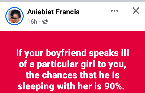 She wrote, “If your boyfriend speaks ill of a particular girl to you, the chances that he is sleeping with her is 90%.”