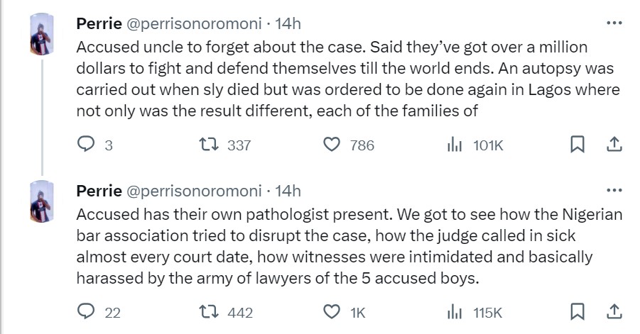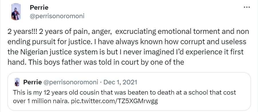 In a series of tweets shared on the microblogging platform X, @perrieonoromoni revealed that one of the accused uncles told the father of the deceased to forget about the case.