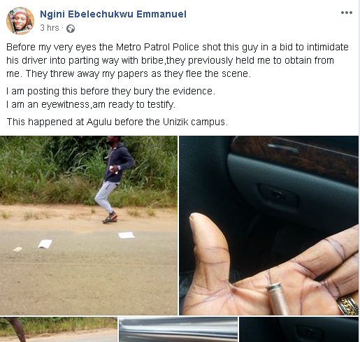 Before my very eyes the Metro Patrol Police shot this guy in a bid to intimidate his driver into parting way with bribe,they previously held me to obtain from me. They threw away my papers as they flee the scene.