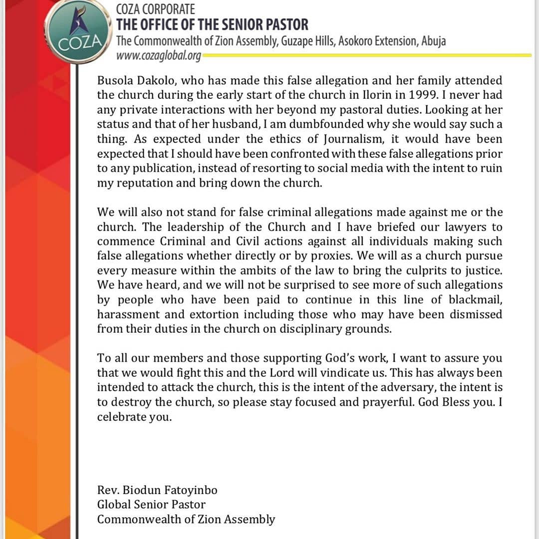 In a statement he released this evening, Fatoyinbo said he has never raped anyone before. He accused Timi and his wife of trying to extort him.