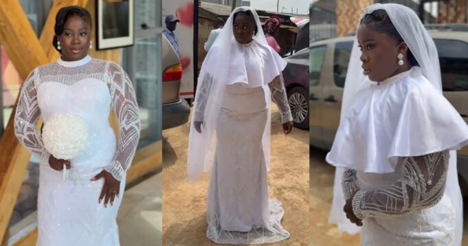 In a viral video, the bride is seen wearing a white wedding gown with a fitted bodice and stylish neckline.