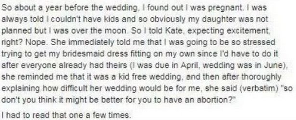 She reminded me that it was a kid free wedding, and then after thoroughly explaining how difficult her wedding would be for me, she said (verbatim) ‘So don’t you think it might be better for you to have an abortion?’