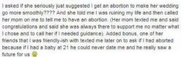 I asked if she seriously just suggested I get an abortion to make her wedding go more smoothly. She told me I was ruining my life and then called her mom on me to have an aborrtion.