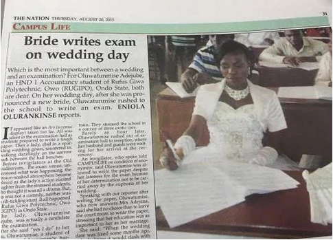On her wedding day, Oluwatunmise Adejube, a student of Department of Accountancy, hurriedly left the Owo local government area, where she swore matrimonial oath, and rushed to the school to write an exam.
