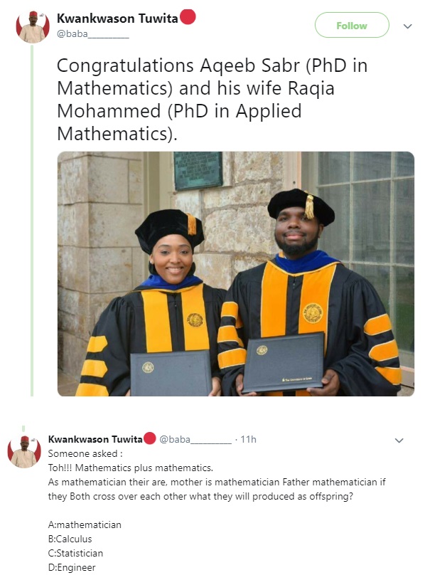 The couple pictured above, have become an internet sensation after they bagged PhD in Mathematics and Applied Mathematics from the same university at the same time.