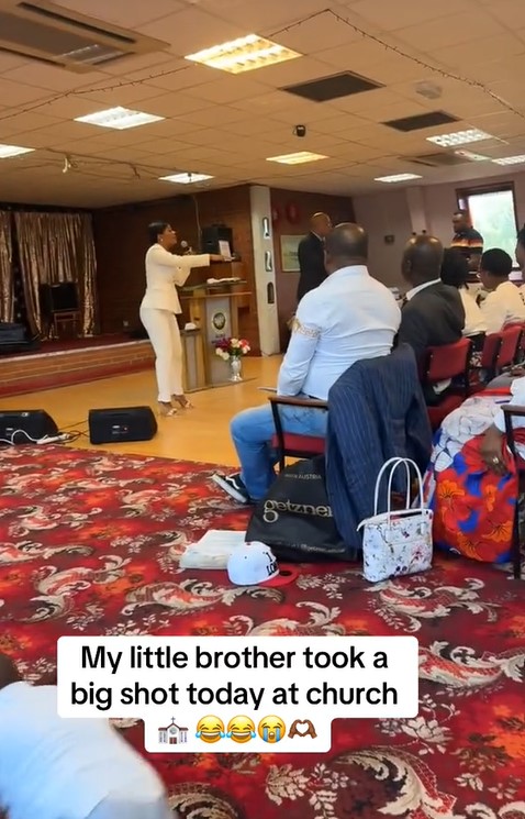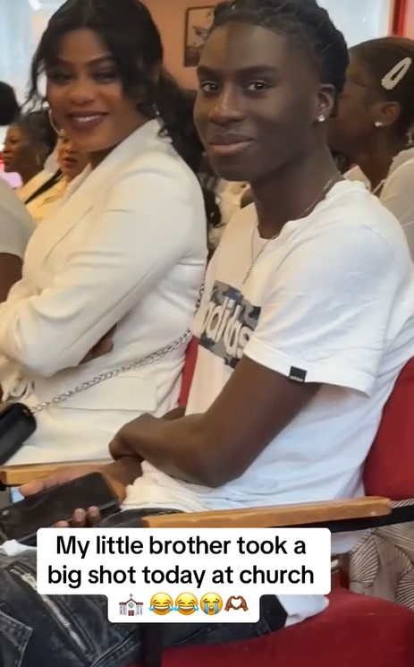 Her brother was seated quietly, smiling sheepishly while the congregation looked in his direction.