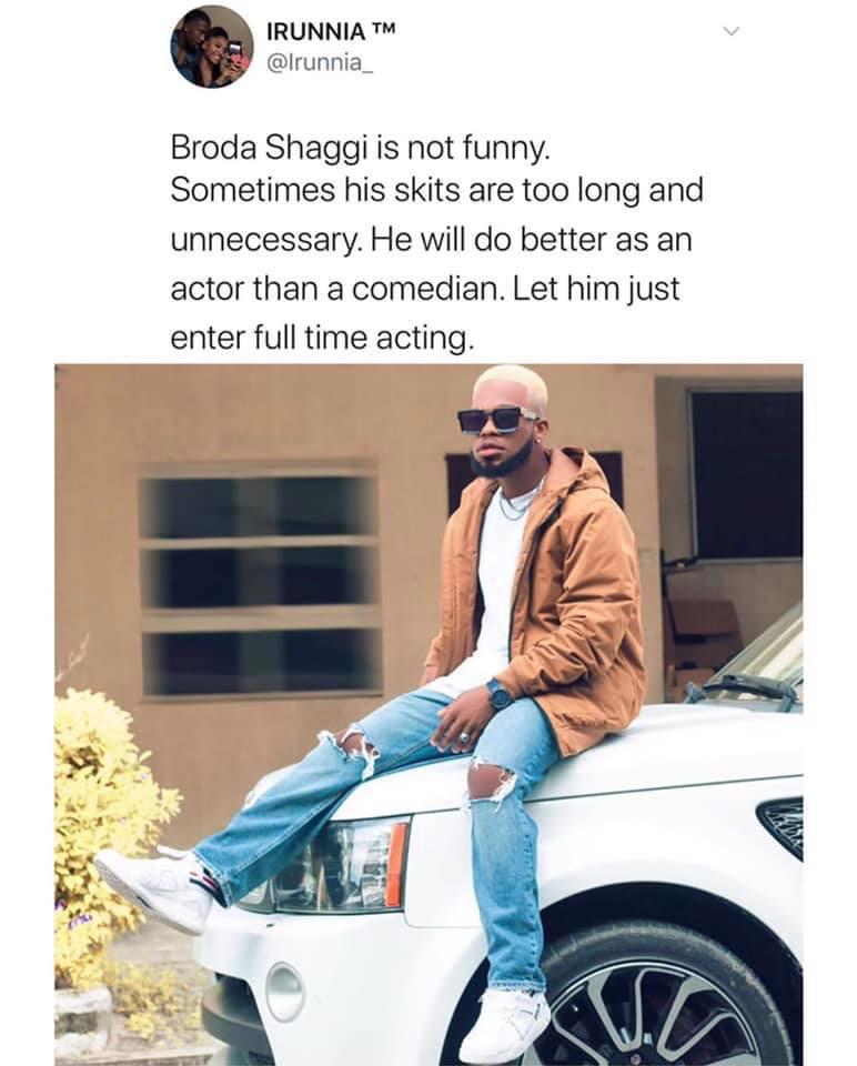 Popular Nigerian social media comedian, Broda Shaggi has been considered not so funny by a Nigerian Twitter user.