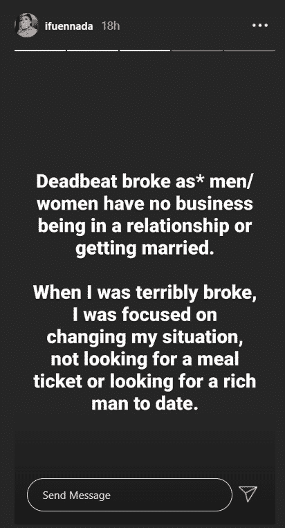 Big Brother Naija 2018 housemate , Iheme Faith Uloma, popularly known as Ifu Ennada, has taken ton her social media page to berate broke people whose focus is to get into a relationship.