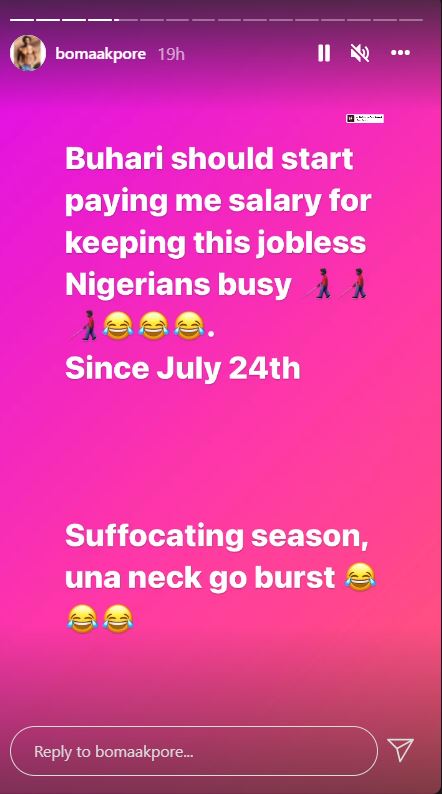 Taking to his Insta-stories, he described Nigerians as jobless and stated that the president should start paying him for keeping her citizens busy.