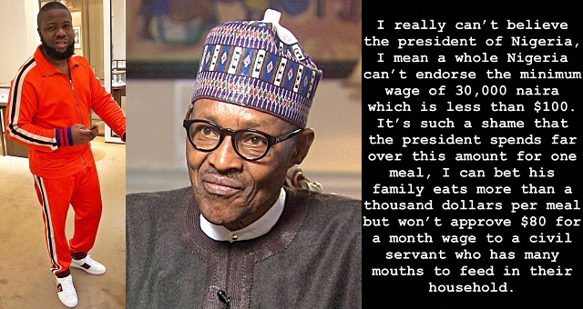 Flamboyant Nigerian Instagram celebrity, Hushpuppi, has taken a shot at President Buhari for not expressly approving the N30,000 minimum wage being demanded by the Nigeria Labour Congress NLC.