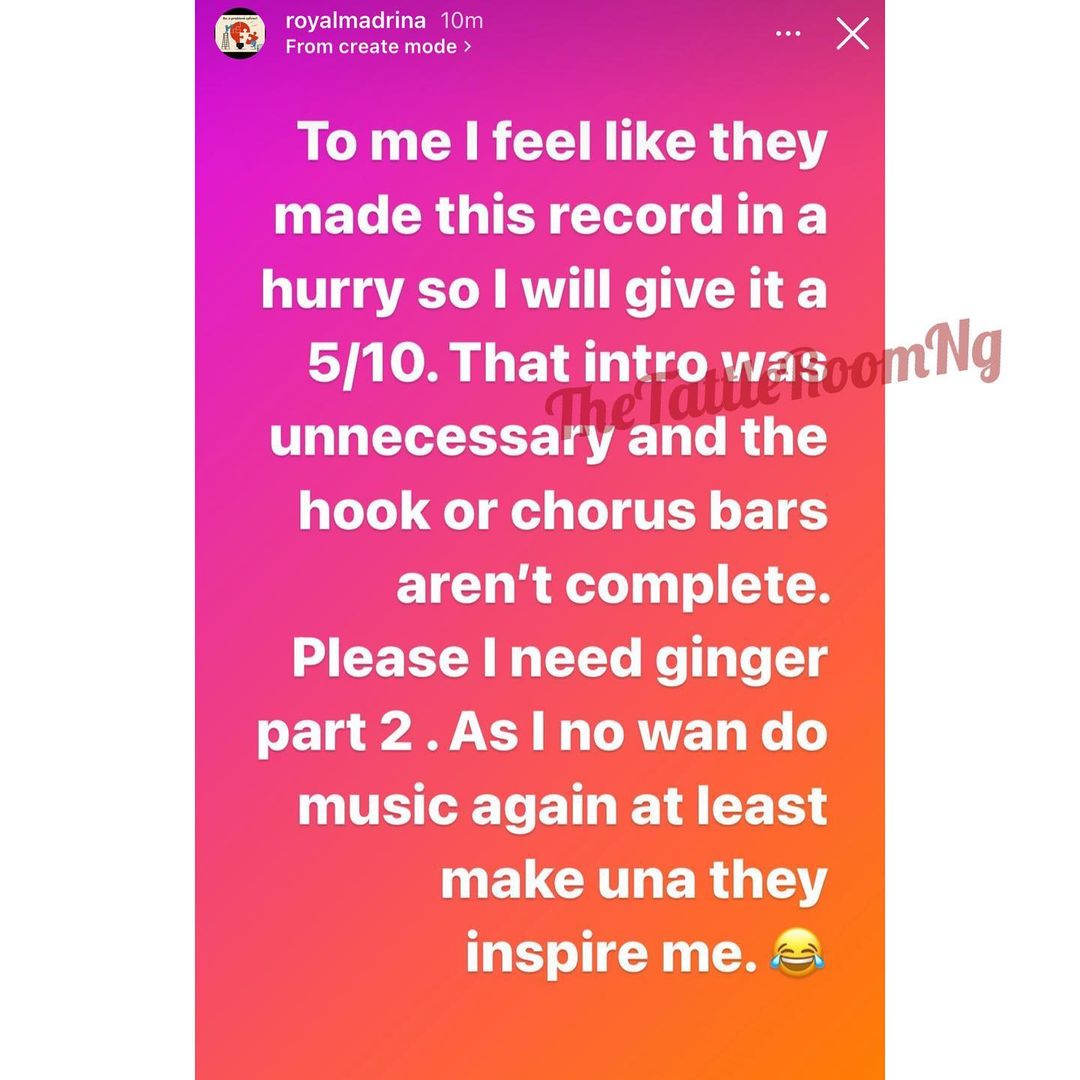 “Burna Boy is loosing it with his music arrangement. Wiz kid was ok but his last 4bars was weak. #b’dor. To me I feel they made this record in a hurry so I will give 5/10. That intro was unnecessary and the hook or chorus bars aren’t complete. Please I need ginger part 2. As I no wan do music again at least make una dey inspire me”.