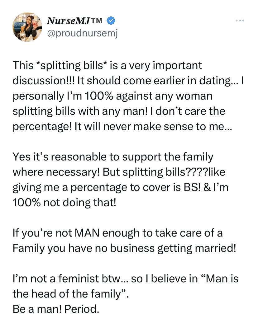“This splitting bills is a very important discussion!!! It should come earlier in dating… I personally I’m 100% against any woman splitting bills with any man! I don’t care the percentage! It will never make sense to me… Yes it’s reasonable to support the family where necessary!
