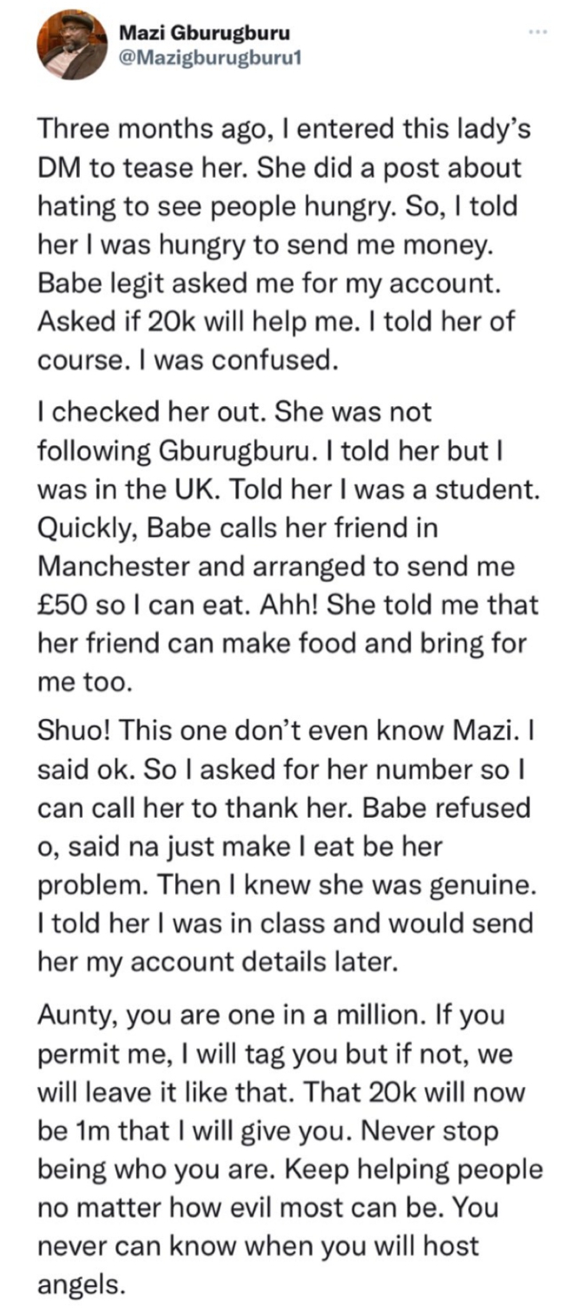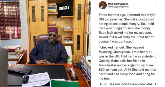 A Nigerian businessman who’s known on Twitter as Mazi Gburugburu, recently took to his page to reveal his plan to reward a lady because of her quite surprising act of kindness after he teased that he was hungry and needed money.