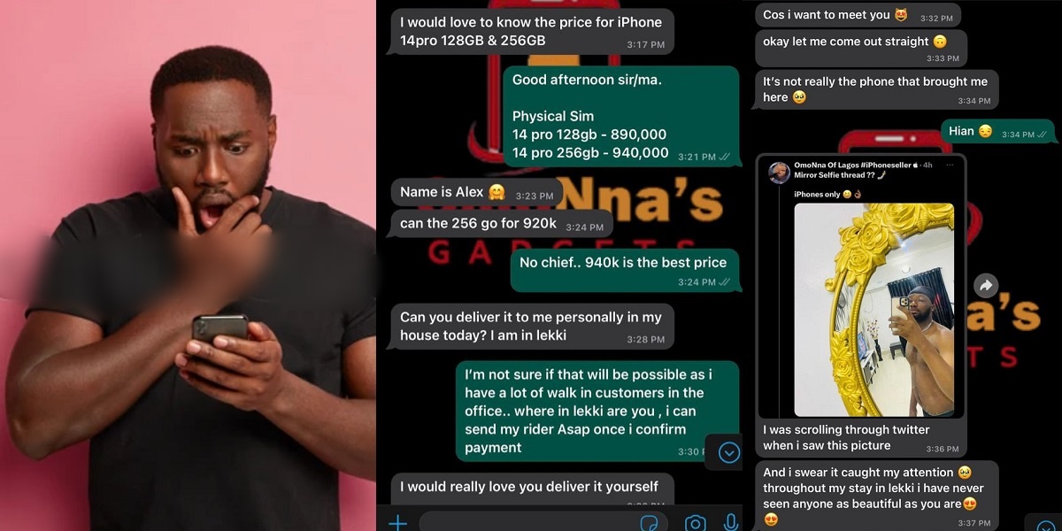 The phone dealer, identified as @omonna14 on Twitter, shared screenshots of his conversation with the said client, who pretended to be interested in purchasing a phone in order to get his attention.