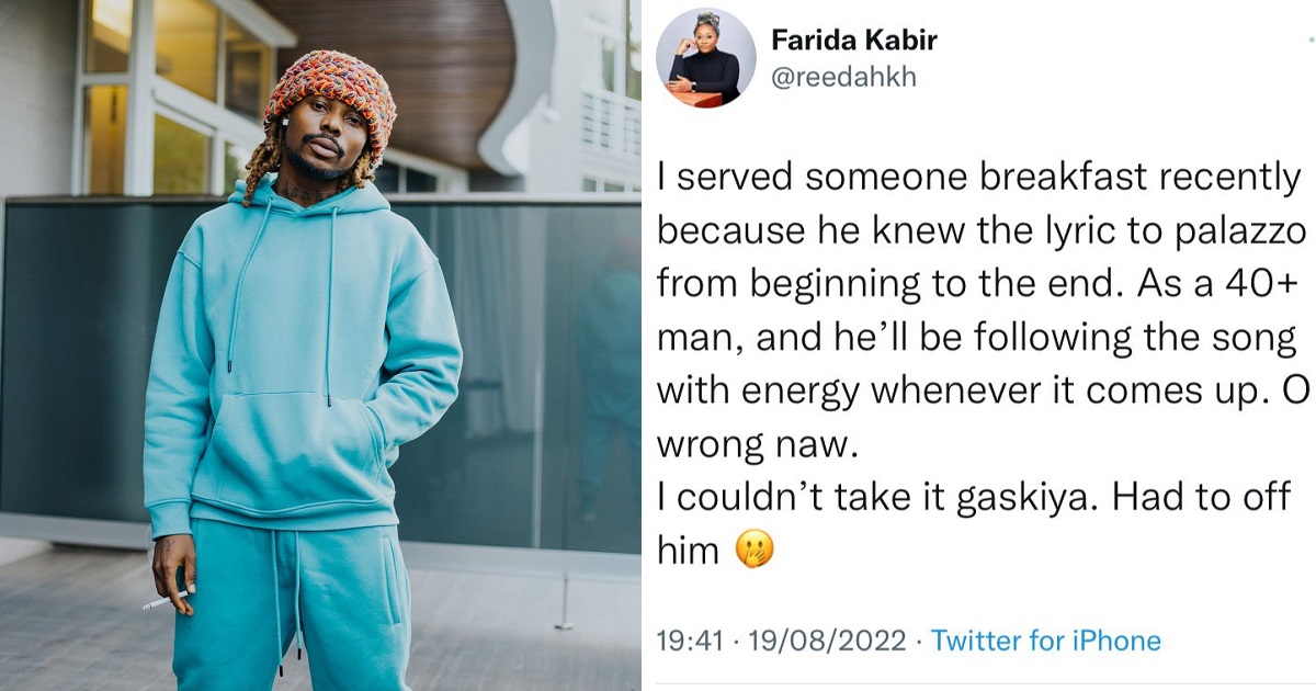 “I served someone breakfast recently because he knew the lyric to palazzo from beginning to the end. As a 40+ man, and he’ll be following the song with energy whenever it comes up. O wrong naw. I couldn’t take it gaskiya. Had to off him”