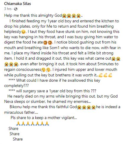 A Nigerian mom, identified as Chiamaka Silas, is overwhelmed with gratitude to God for saving her one-year-old son after he swallowed a key.