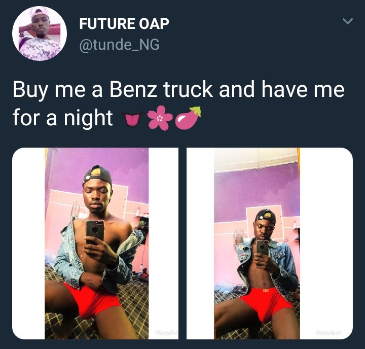 A Twitter user identified as @tunde_NG, has taken to the platform to appeal to his followers to buy him him a Benz truck if they want to have him for a night.