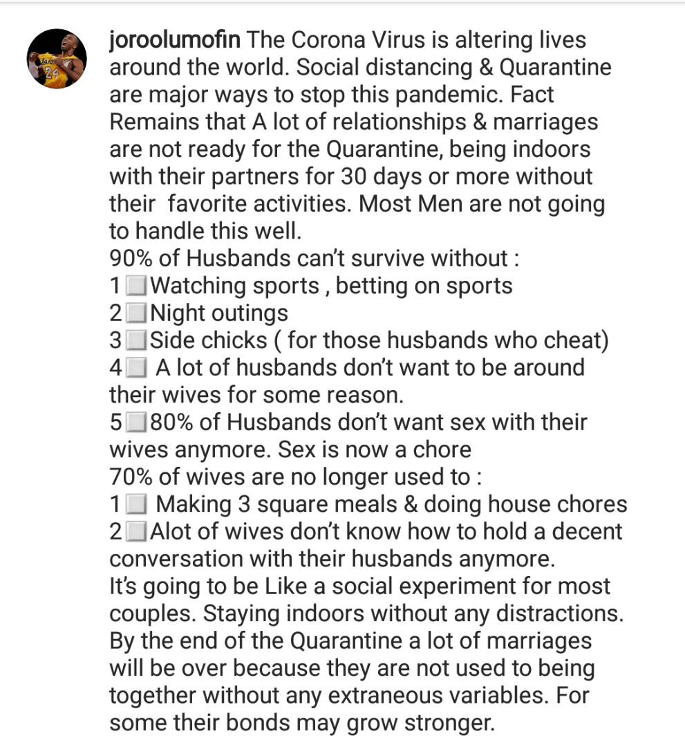 People have been advised to stay at home and maintain social distancing in order to curb the spread of the deadly disease, and according to Joro relationships and marriages are not ‘ready for the Quarantine’ because it will seem like a social experiment for most couples, staying indoors without any distractions.