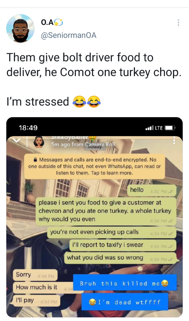Narrating the bizarre incident of the micro-blogging platform, Seniorman wrote, “Them give bolt driver food to deliver, he Comot one turkey chop. I’m stressed 😂😂”,