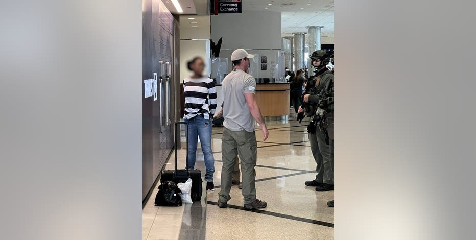 A picture shared with FOX 5 shows Raïssa dressed in a black and white stripped shirt and blue jeans, standing handcuffed in front of the Truist Bank ATMs in the South Terminal.