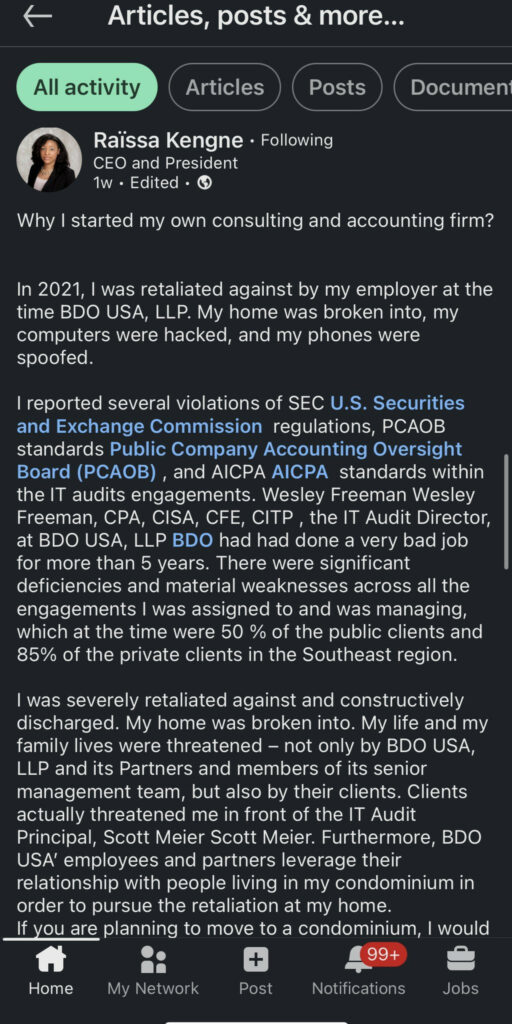 She also took to LinkedIn to reveal that she started her own company because of the mistreatment she suffered in her former job.