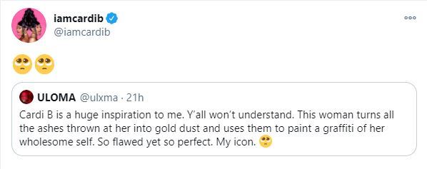 American rapper, Cardi B has reacted to a tweet by a Nigerian fan who described her as a huge inspiration to her, considering how she turns all the negativity thrown at her into something beautiful.