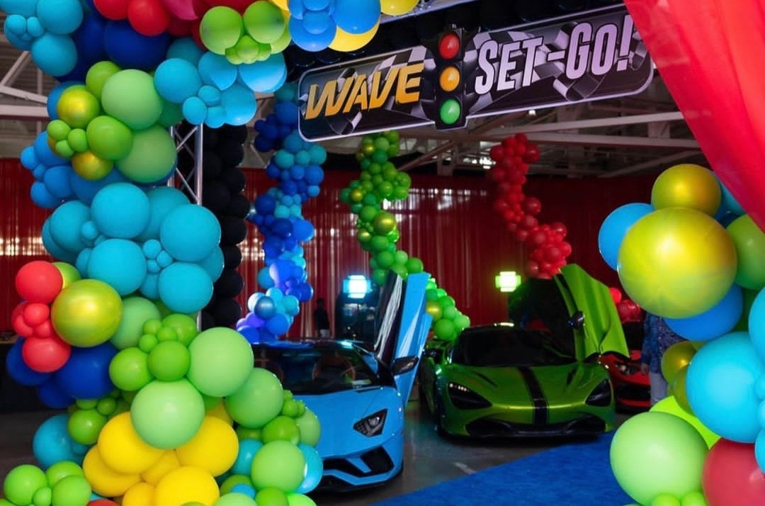 Party guests watched as baby Wave made his impressive entrance through huge green and blue balloon arches. When the car nearly came to a standstill, Wave’s big sister, Kulture, was on hand to push him along to keep him going on his way.