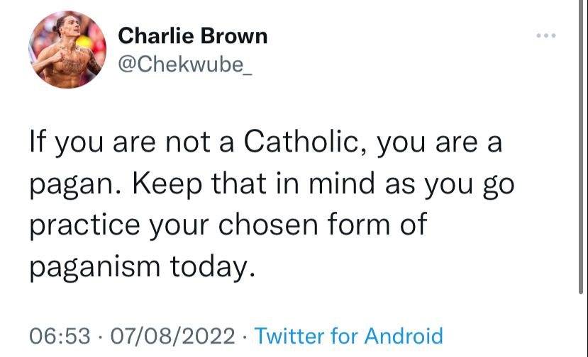According to @chekwube_, anyone who is not Catholic is a pagan because the only churches the Holy Bible recognizes are Catholic and Apostolic Church.