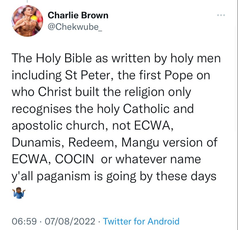 The Holy Bible as written by holy men including St Peter, the first Pope on who Christ built the religion only recognises the holy Catholic and apostolic church, not ECWA, Dunamis, Redeem, Mangu version of ECWA, COCIN or whatever name y’all paganism is going by these days.”