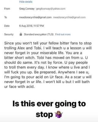 Former BBNaija 2018 housemate, Cee-C has received an acid threat from a concerned Tobi and Alex’s fan.