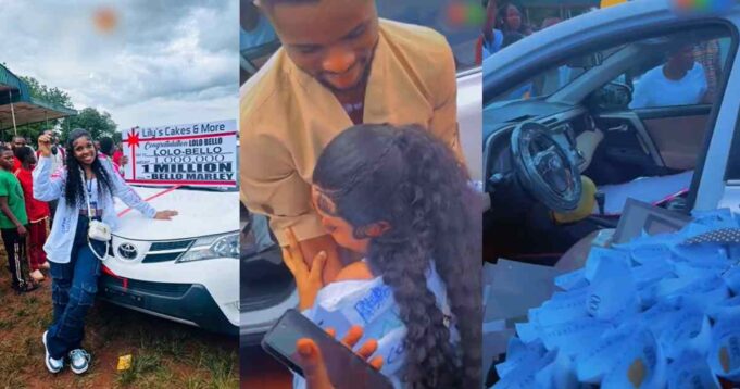 Accompanied by the car gift, the man surprised his wife with a bouquet of cash worth ₦1,000,000 and custom-made gift items.