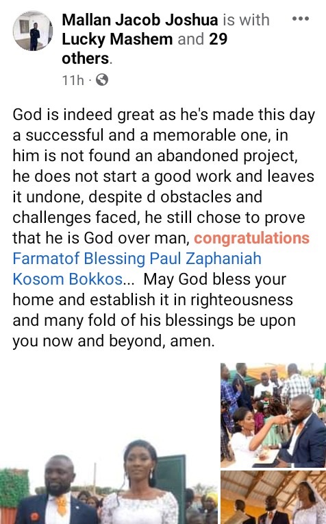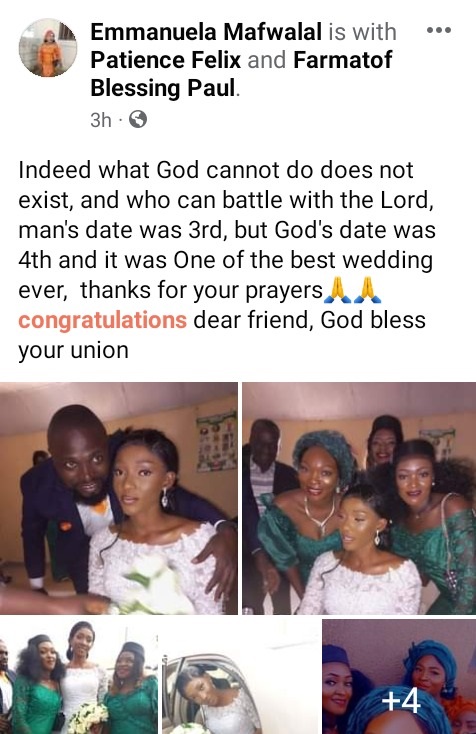 Taking to Facebook to express gratitude to God for her safe return and the success of the wedding a friend of the couple wrote,