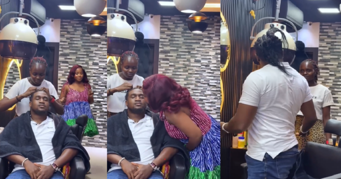 The video showed Veekee James’ husband, Femi Atere at a hair salon, getting his hair made by a female hairdresser with his eyes closed.
