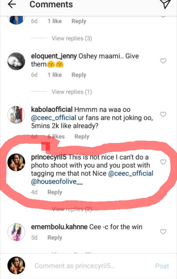 According to his Instagram Post, he was approached for a free Photoshoot for Cee-c which he agreed to after some days, the photo sessions was done and Cee-C got the photos but ended up not giving him some credit for the photos.