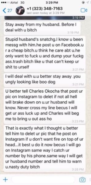 “Stay away from my husband. Before I deal with u bitch. Stupid husband’s snatching. I know you have been messaging him. He post you on Facebook. U r a cheap bitch. U think he care about you. he only want to fcuk u and dump your fucking ass. trash bitch like you that can’t keep ur shit to urself.