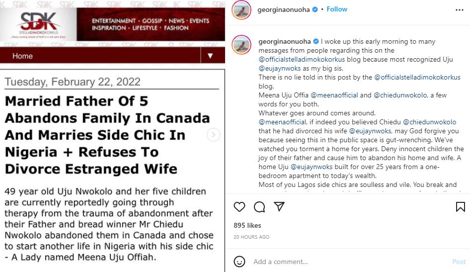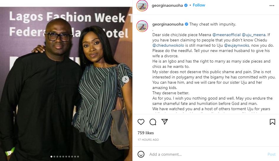 Dear side chic/side piece Meena @meenaofficial @uju_meena. If you have been claiming to people that you didn’t know Chiedu @chiedunwokolo is still married to Uju @eujaynwoks, now you do.