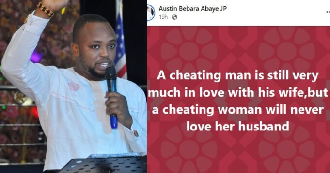 A Nigerian journalist, Austin Bebara Abaye JP, has opined that men who cheat on their wives love them very much, unlike women who cheat on their husbands.