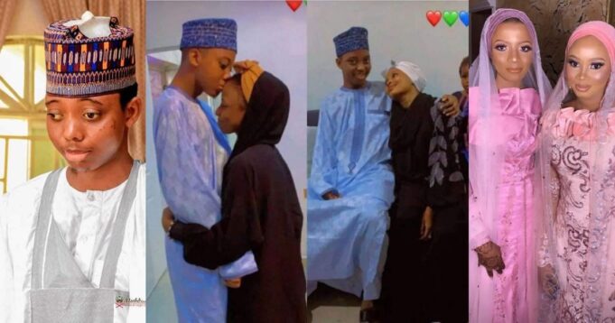 22-year-old Mustapha Ado Bayero, the son of late Emir of Kano, Mustapha Ado Bayero in new photos is pictured with his new wives, Badi’a Tasiu Adam and Fatima Ibrahim Dahiru.